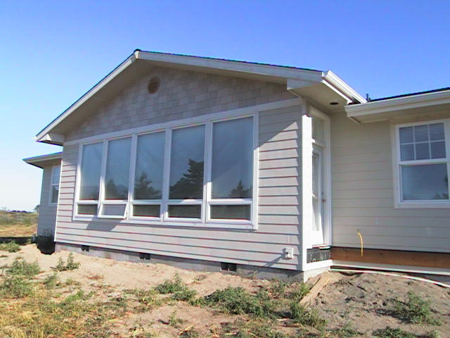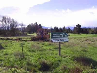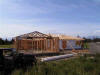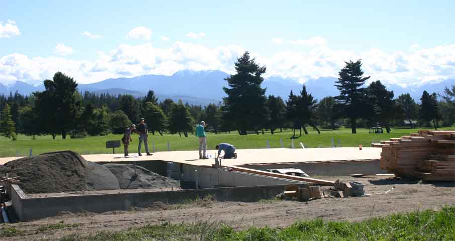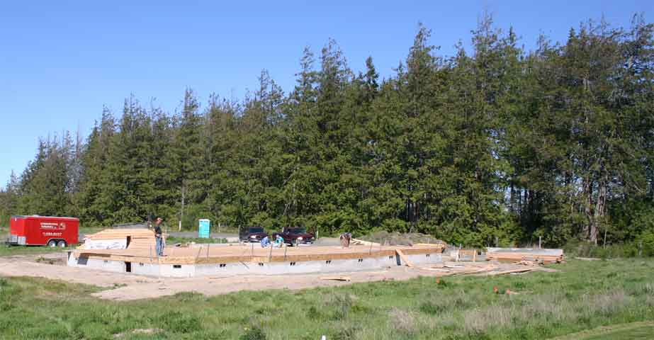 Construction ProgressHere are some selected photos from our construction experience during the spring and summer of 2004. Cornerstone Builders did the work, and the entire process was really a lot of fun, and missing the stress that many people find in their building experience. April 2005 update - We've completed most of our unpacking, but much remains to be done before this house is "home". There are pictures that need to be hung, and some of the shop equipment is not quite operational. The lot has been contoured and amended, and sprinklers have been installed, but the grass and plants will have to wait 'til June. We're really enjoying the mild weather. Our south facing deck is sheltered from prevailing winds, making it a warm and comfortable place to sit when the sun is out, even in December. And, we've begun to work with a non-profit art group in Port Townsend, to meet regional artists. We broke ground March 26, 2004; by April 21, decking was complete By May 13, the trusses arrived By August 10, interior painting was nearly complete, and the Brazilian Cherry flooring had arrived. August 20-23, and the flooring is going down!