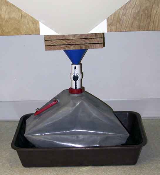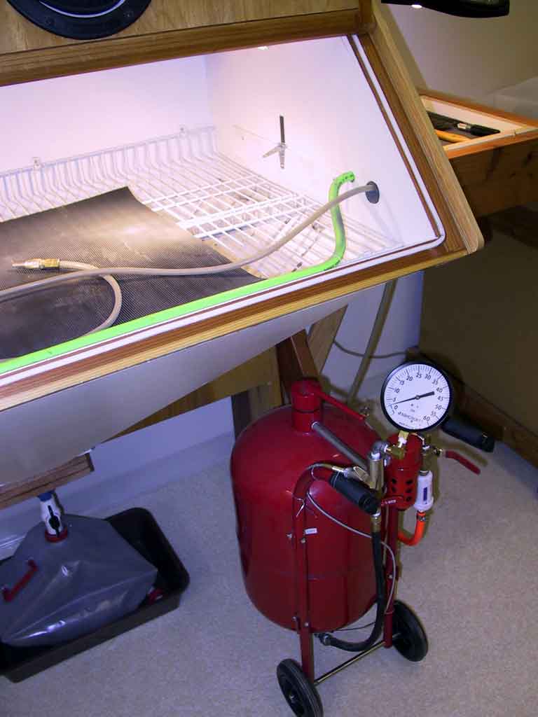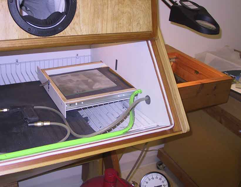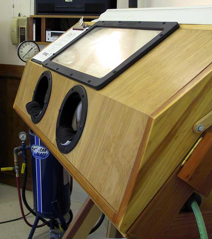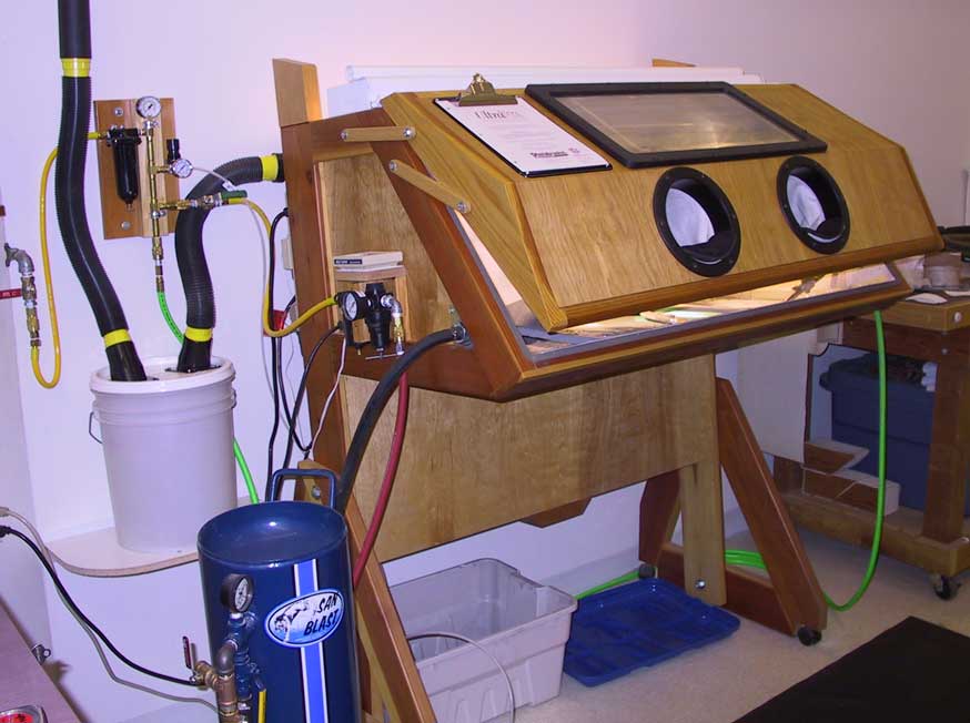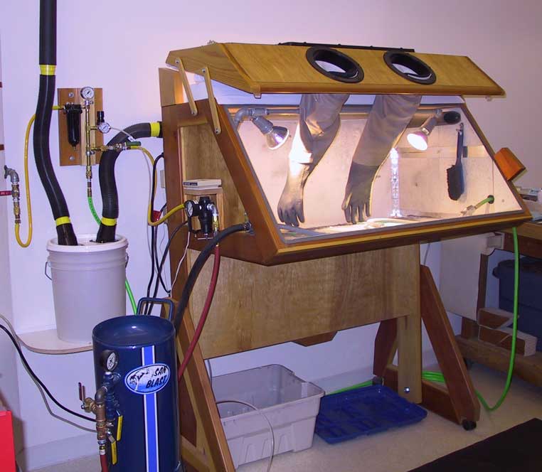 Until May 2003, we used a second generation blast cabinet that I designed in 1998 to accommodate my aching back. The front of the cabinet articulated, and the glove ports are gel filled (mouse pads) to spare the forearms. Two pressure pots with 220 mesh Silicon Carbide, and 3/32, 1/16 and 1/32 inch nozzles provide the abrasive at about 25 psi, less for shading and contouring. I've attached a vibrating screen and funnel to the bottom of the booth, so that the screened abrasive falls fully contained into a 5 gallon REI collapsible water jug. Recharging the pressure pots is a simple matter of inverting the jug over the pot, and letting the abrasive flow into the pots through a piece of 3/4 inch PVC. Fully contained, no dust.