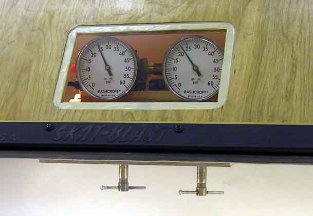 Big 3 1/2 inch gages sit on top of the cabinet, with handles that extend into the blast cabinet; I can finally tweak the pressure with one hand, while exercising the guns with the other.