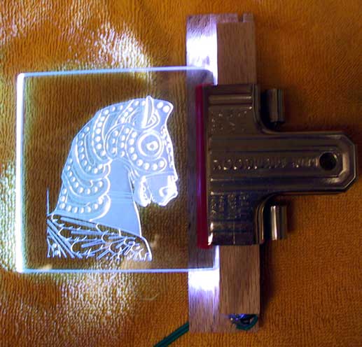 Most of the work we do is multistage carved. Often, a piece that looks great under the lights in the cabinet, displays subtle flaws when edge lit. The solution was to edge light the glass during blasting.