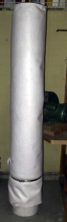 The one micron filter shown at the left was fabricated by American Fabric Filter to fit over a standard five gallon bucket, and mates to a Grizzly one-horse dust collector.